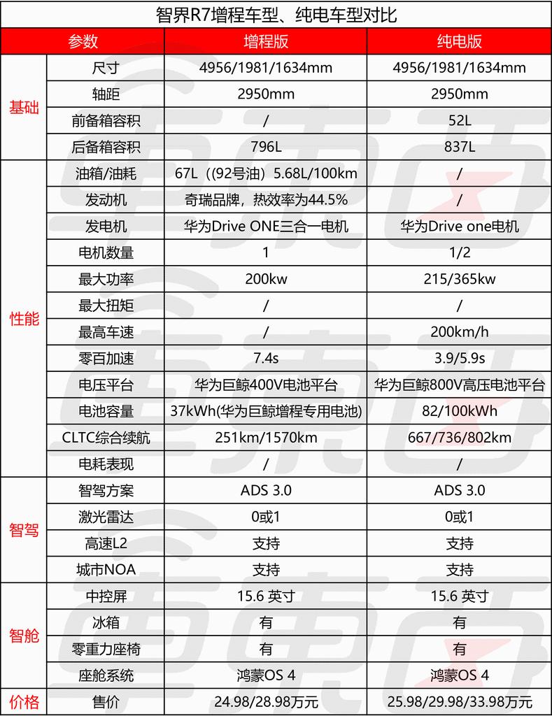 ▲智界R7增程、纯电车型对比