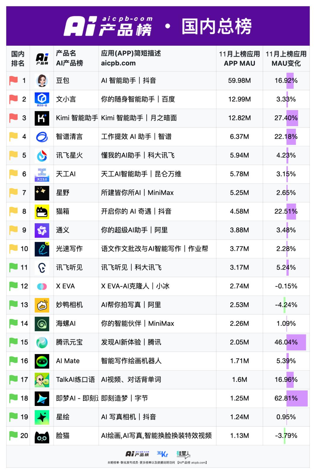 根据【AI产品榜】的统计,截至2024年11月,字节旗下豆包以近6000万的月活用户将文心一言(1300万月活用户)远远甩在身后。而另一家网红产品KIMI与文心一言体量相当,但后者在广告投流上更舍得花钱,增长量明显高于百度。
