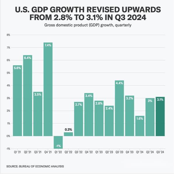 尽管如此,周四公布的部分经济数据为市场提供了一些支撑。美国商务部发布的最终数据显示,美国经济在第三季度年化增长了3.1%,超出市场预期,显示出美国经济仍具韧性。
