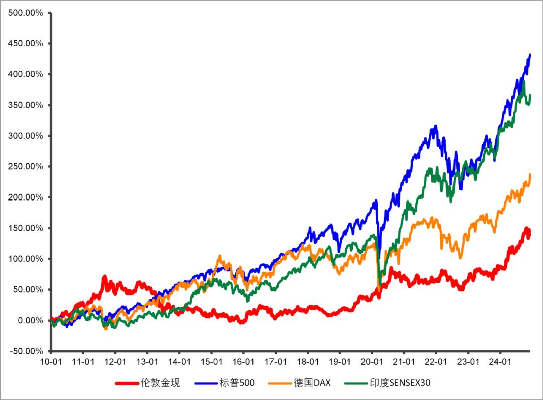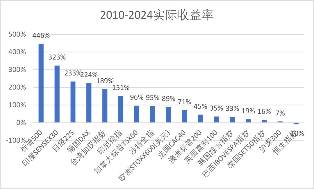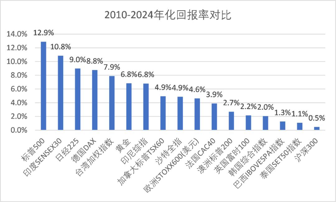 2010-2024年这15年间,世界整体算得上比较盛世了,但在这期间,黄金的年化涨幅是6.8%,全球主要股票指数中,只有美股、印度、日经和中国台湾,这四个市场表现比黄金略好一些。