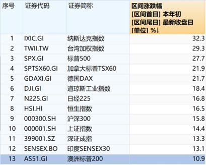 在万得收录的22个全球主要股票指数中,有18个年内取得了正收益,收益率超过10%的指数高达13个。在中国资产中,一直体现A和H不相关的沪深300和恒生指数,甚至同步实现了16%左右的收益,也是历来罕见。