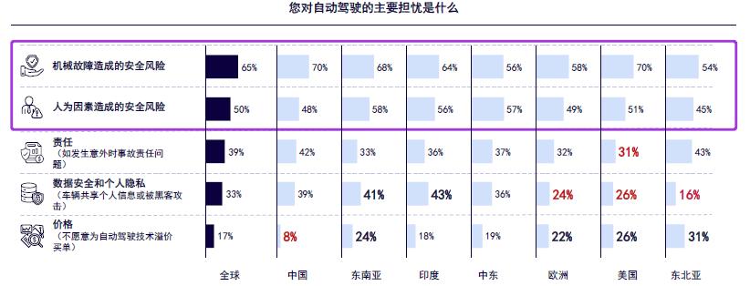 需要注意的是,除安全性外,用户对发生事故时的责任判定问题,也表示出担忧。从目前各国司法实践看,对因自动驾驶问题而造成的事故通常认定为驾驶员的责任,这降低了用户对自动驾驶使用的积极性。同时,“数据安全和个人隐私”问题也受到用户的关注,主要是担心车辆共享信息或被黑客攻击,这一问题在欧美地区尤其受到关注。