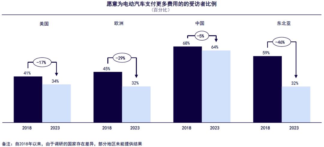 过去五年中,愿意为电动汽车(BEV)支付溢价的意愿在全球范围内都在下降(图 8),其中东北亚的降幅最大(从46%降至32%),而中国的降幅最小,仅下降了5%(降至64%)。当前,电动汽车制造商的降价以及更便宜的中国电动汽车的普及,支持了客户对价格将继续下降的预期。