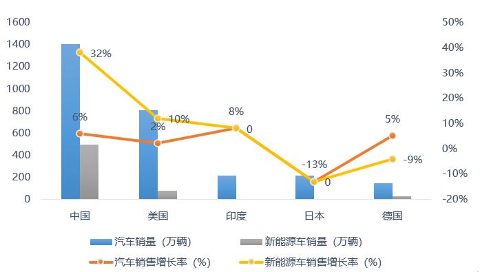 在新能源汽车方面,全球新能源车销量为739万辆,其中中国销量为494万辆,约占全球销量的66%,销售同比增长32%。拥有明星品牌特斯拉的美国,新能源车销量76万辆,同比增长10%。而作为传统汽车强国的德国,虽然汽车销售总量增长了5%,但新能源车的销量反而下降了9%,仅为27万辆(图 1)。