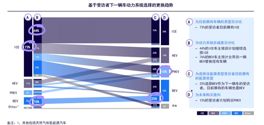 燃油车用户,偏爱购买混合动力车进行过渡。当前ICE买家中有30%预计会选择混合动力,23%则直接转向BEV。45%~50%的现有插电式混合动力车(PHEV)和油电混合动力电动汽车(HEV)买家将坚持某种类型的混合动力。