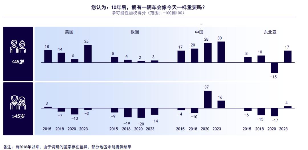 从人口的需求结构看,年轻人依然对拥有自己的汽车保持热情。中国年轻人(45岁以下)对拥有汽车的热情最高,其次是东北亚地区。这与该类地区尚处于新兴市场阶段有关。在较为成熟的欧洲和北美市场,年轻人预计在未来10年内汽车的重要性也在增加。只有欧洲和北美的中年群体(45岁以上)预计随着年龄的增长会逐渐减少对汽车的依赖(图 3)。
