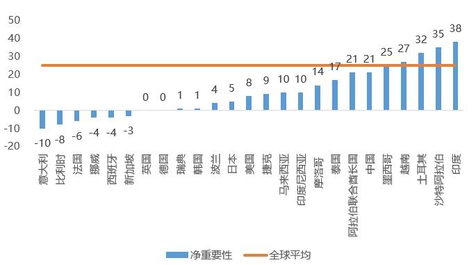 图 2 各国汽车所有权净重要性 注:净重要性取值范围为[-100,100] 资料来源:理特咨询. 《2024汽车出行未来展望》