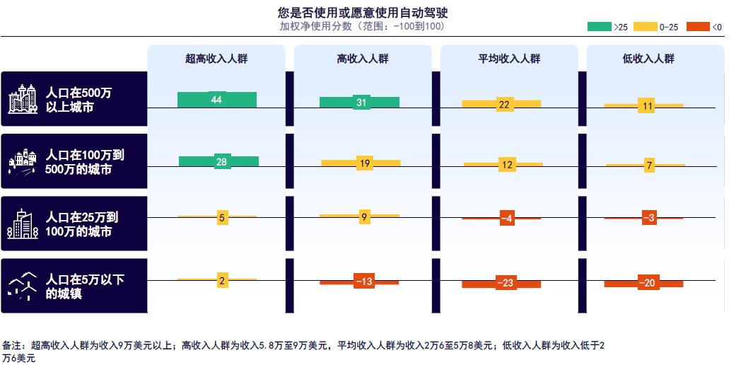不同国别的城市规模,对不同收入人群的影响也不尽相同。在中国,城市规模介于100万至500万人之间的中等收入者的净支持率为34%,而在美国,则需要在500万人口的城市和高收入人群中才能看到类似的净支持率。欧洲、东北亚和美国的受访者最不愿意采用自动驾驶汽车,而印度、中国和中东的受访者则表现出更为积极的态度。