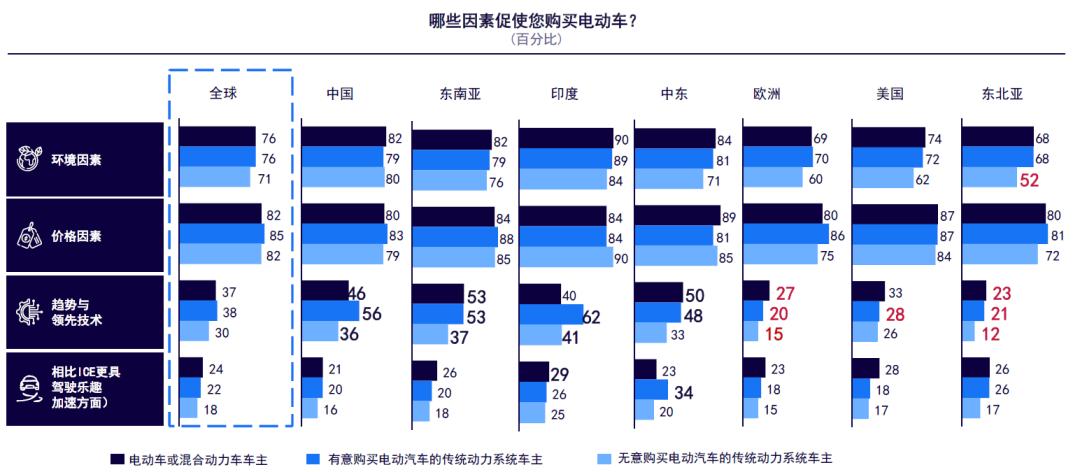 东南亚受访者的反应模式与全球平均水平高度一致,技术设备(31%)、内饰和外观设计(分别为24%和23%)以及新鲜感(24%)的百分比均高于平均水平。大多数东北亚受访者对中国电动汽车不感兴趣,其模式与欧洲相似。