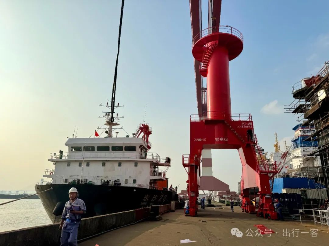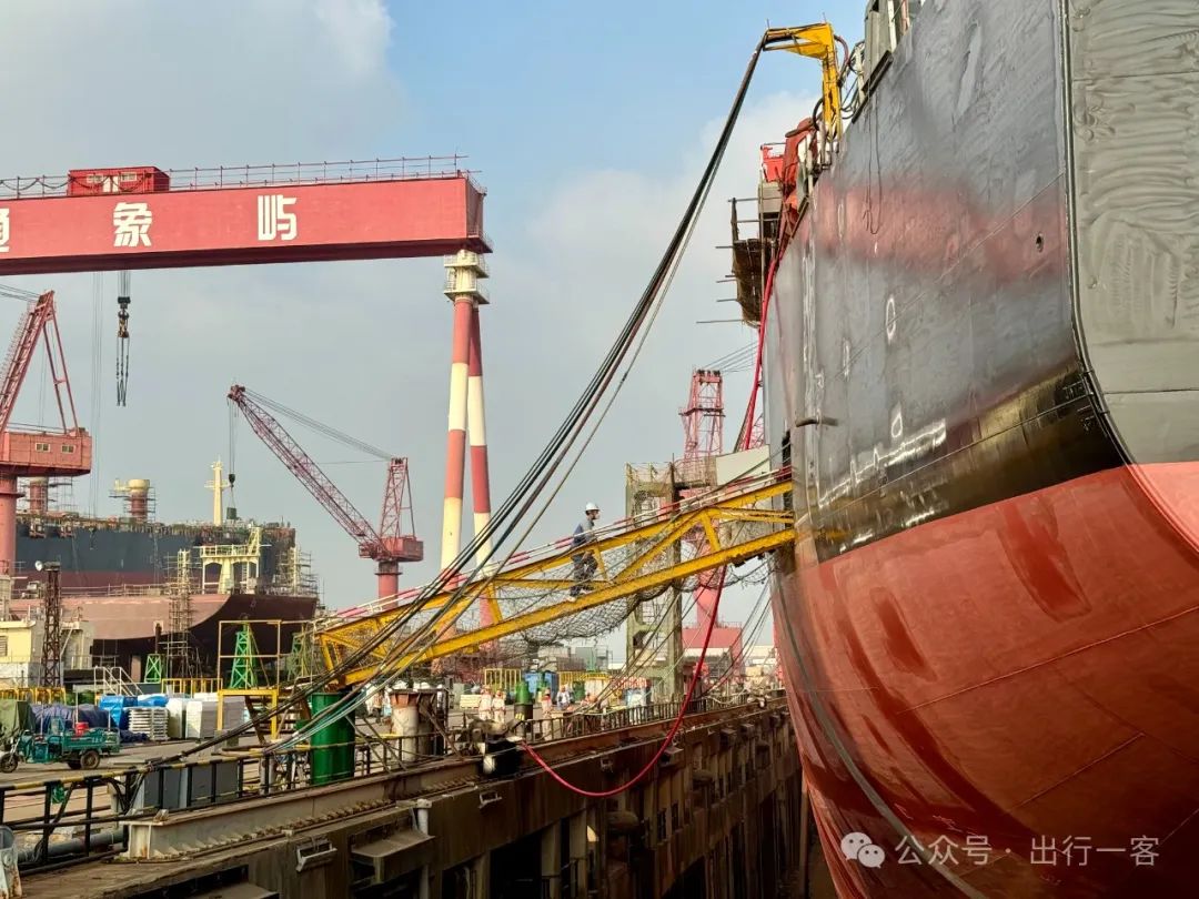《财经》在南通象屿看到,一艘船正在船坞中紧张地赶工中,等待从分段焊接成整体;一艘刚完工的船停在码头边,正在筹备下水做适航认证。头戴各色防护帽的工人在厂区里川流不息,设备轰鸣不停,一派忙碌景象。