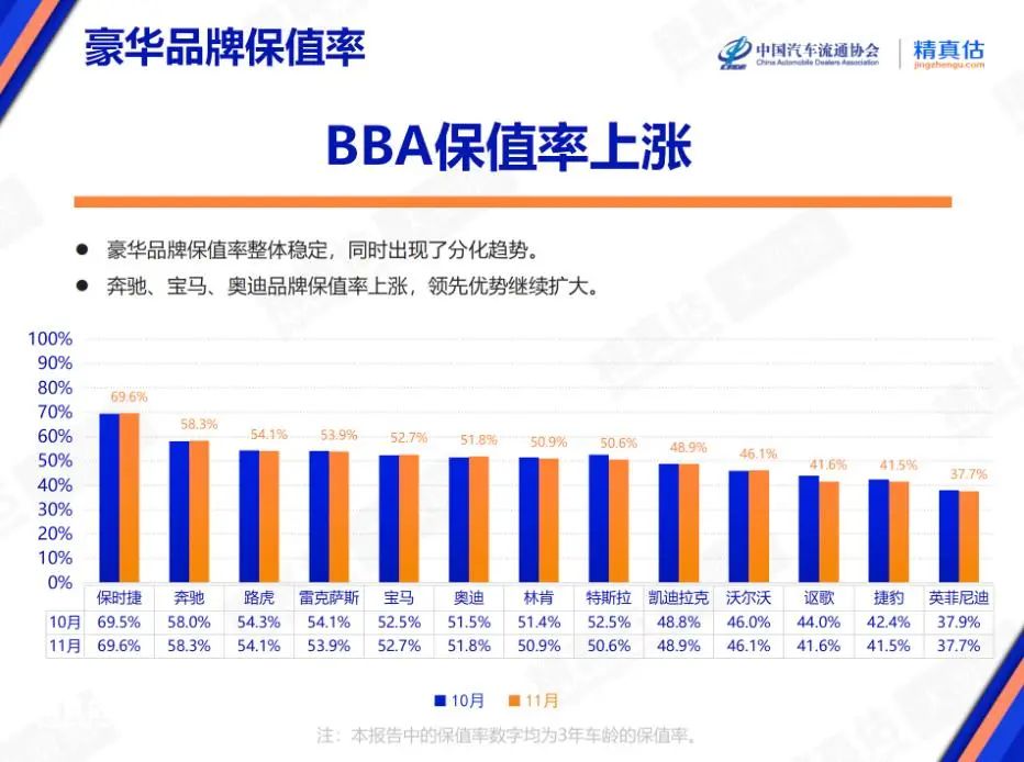 在中国汽车流通协会和精真估联合发布的《2024年11月中国汽车保值率研究报告》中,我们从品牌的三年保值率来看,保时捷69.6%、奔驰58.3%、传祺57.7%、本田57%,这四个品牌牢牢占据了第一梯队;丰田54.8%、路虎54.1%、雷克萨斯53.9%、宝马52.7%、大众52.6%,这五个品牌的保值率都在52%以上;而领克、五菱、奥迪、长安、吉利、哈弗、马自达、林肯、别克、特斯拉、日产、现代、名爵、起亚,都超过了50%。