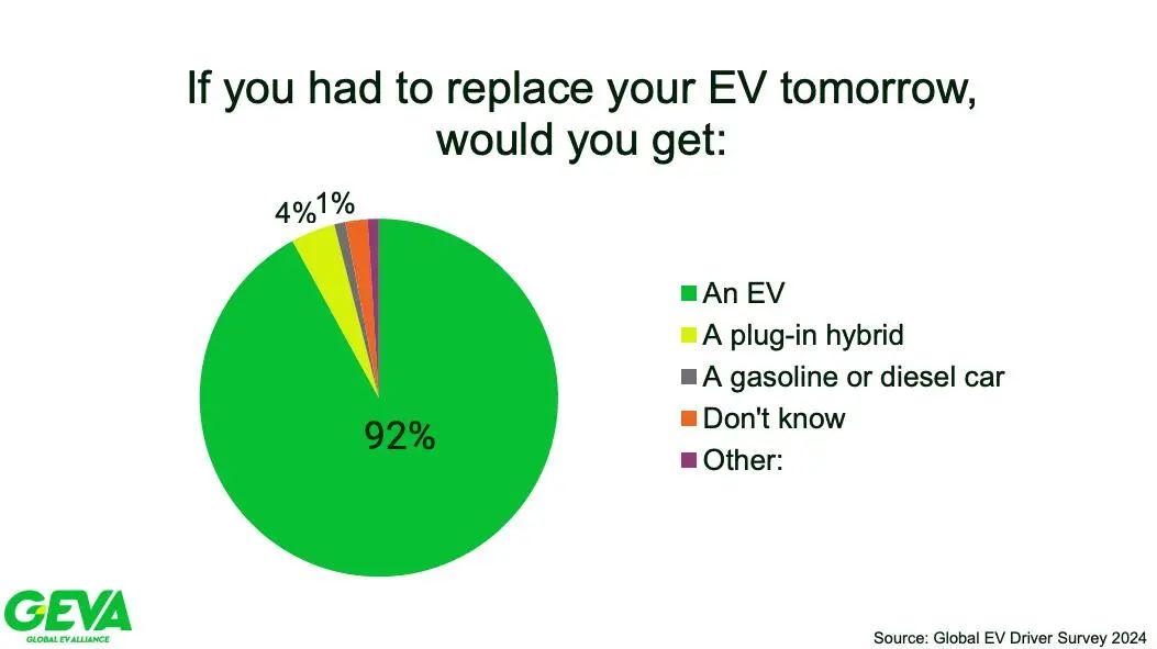 日前,全球电动汽车驾驶员协会联盟(Global Alliance of EV Drivers' Associations,简称GEVA)公布的一项调查表明,只有1%的电动汽车车主,希望重新购入一辆汽油或柴油车。