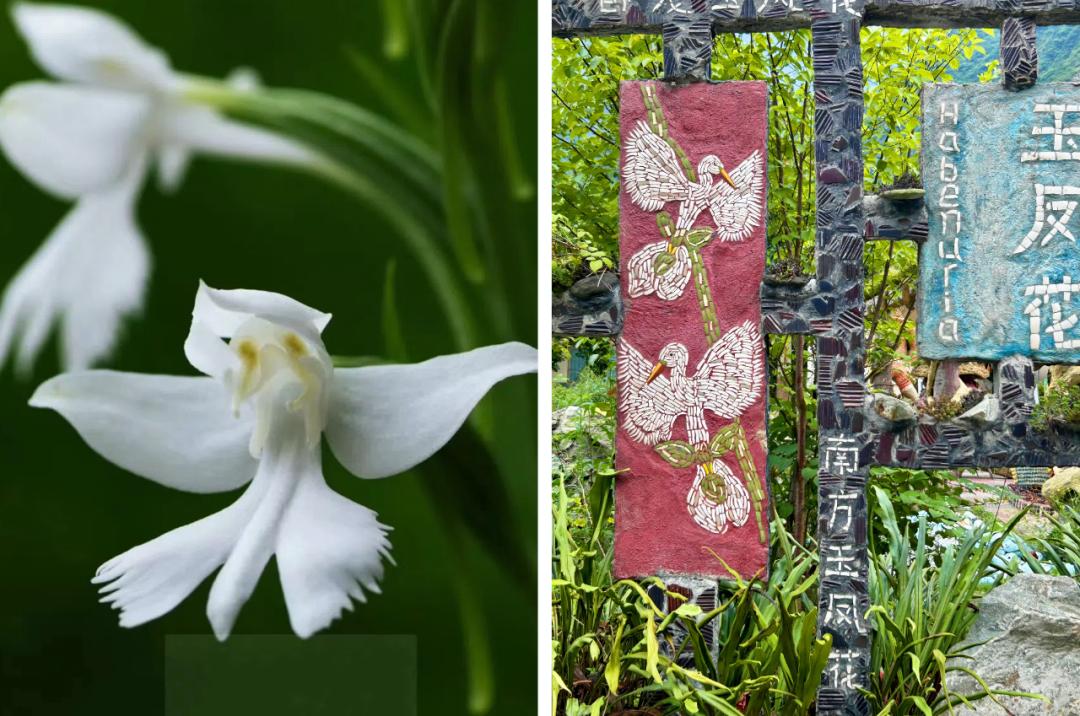 植物园里的玉凤花(左)被做成了拟人化的马赛克图案(右)