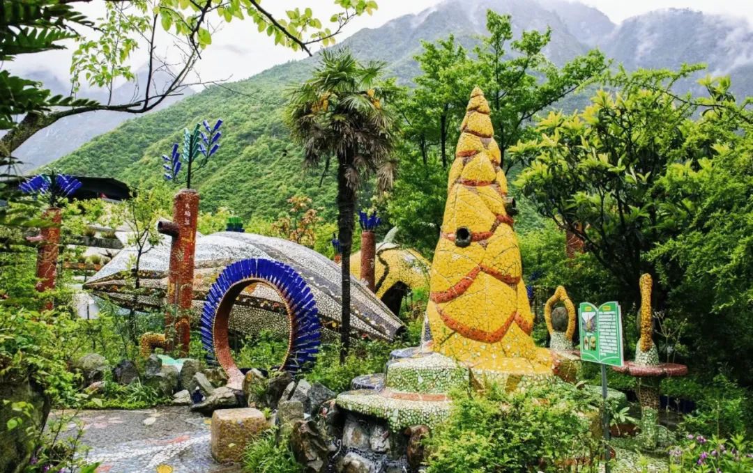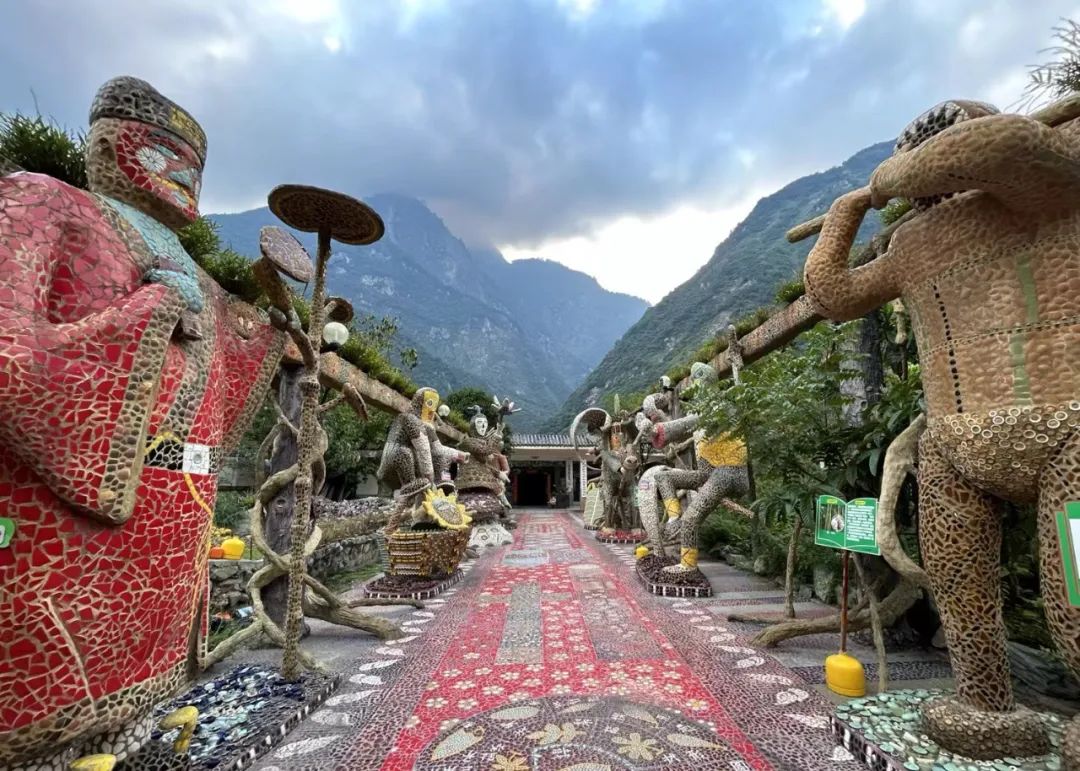 一进园,3米高的“植物界八仙”守护在路的两侧,古怪又呆萌,“每个神仙都有一个植物法器,就像八仙过海”,刘明带着我们往里走。彩色的瓷片小径通向植物形态的马赛克雕塑——百合亭,龙胆亭,塔黄塔,“你可以把自己想像成访花的昆虫”。