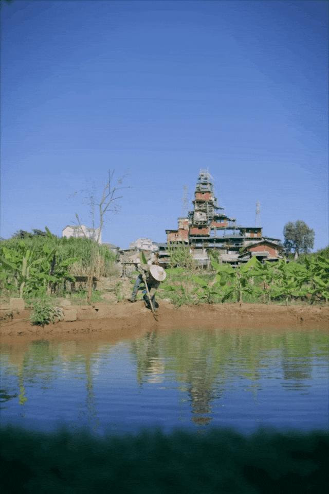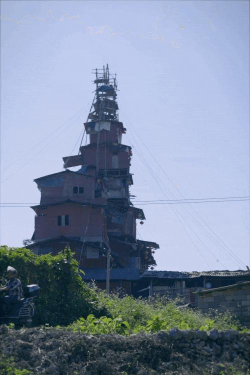 城堡的一楼是祖上三代留下的老瓦房,陈天明靠自己的想象,将它拔高了20米。父母和弟弟住在一楼的老房子里,而他自己从2019年开始,每建一层楼,就向上搬一层。