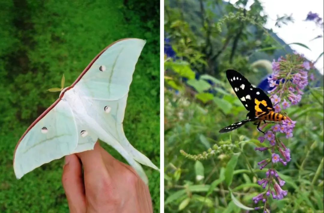 植物园里的绿尾大蚕蛾(左)和蝴蝶(右)