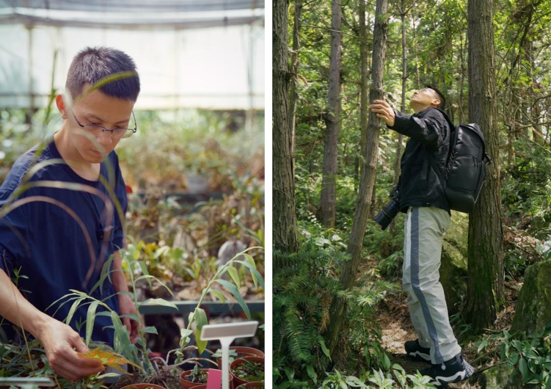 刘明为植物做日常维护(左)、在山野中考察(右)