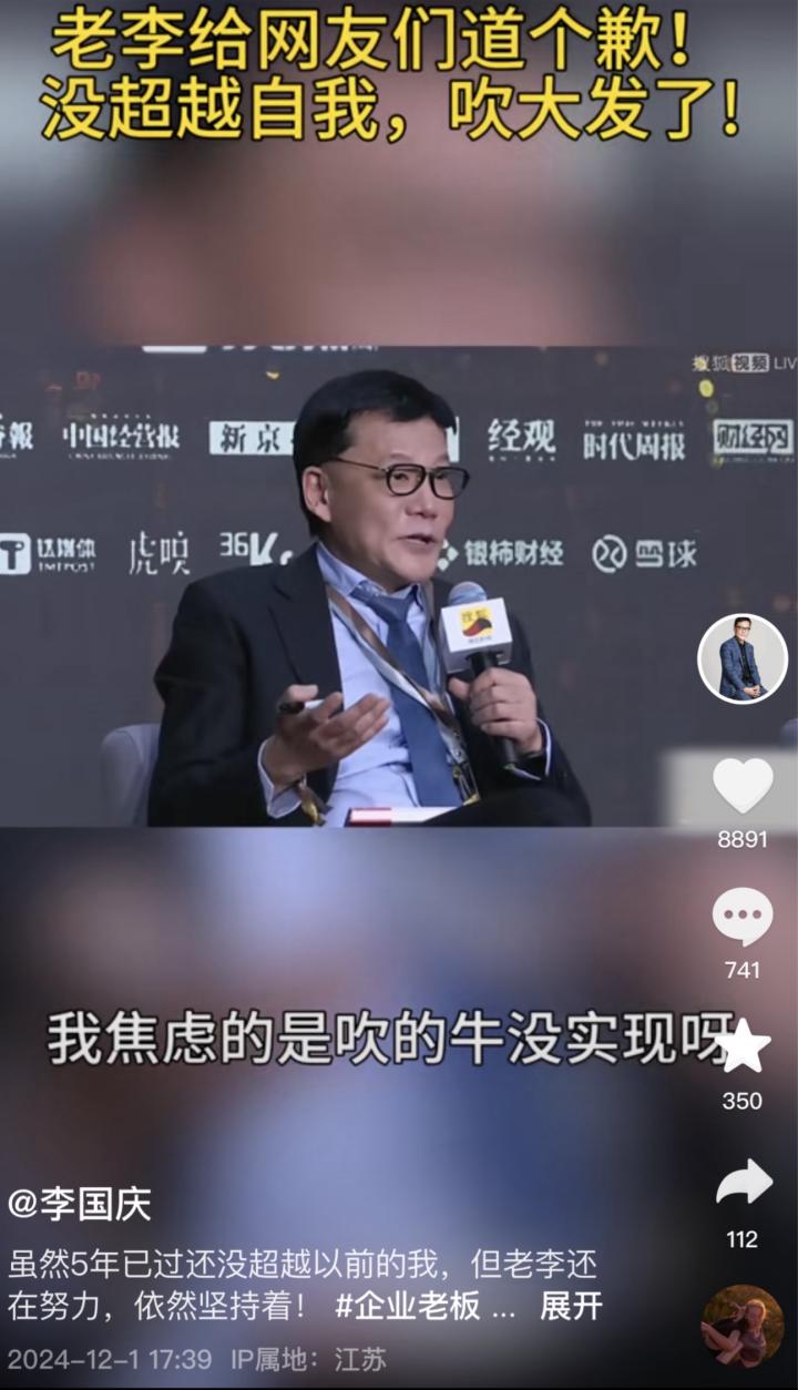 在搜狐论坛上,李国庆也自嘲:“我焦虑的是,吹的牛没实现,跟大家道个歉啊,当年净身出户时说给我5年,再打造一个像当当一样的平台,没做到,真有点寒碜啊。”