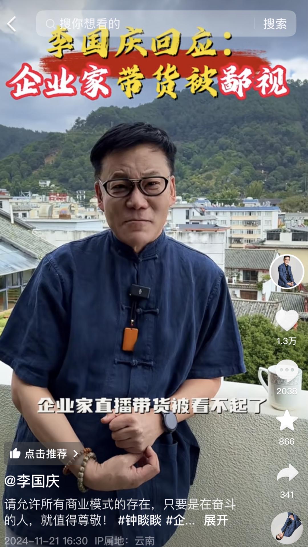 为了保持热度,李国庆也经常在个人账号中点评一些热点,例如李子柒归来、董宇辉小作文事件、雷军造车等等,不久前还回应过钟睒睒的“看不起”发言,表示“一批企业家给自己的产品代言,品效结合,不仅带来流量和曝光量,还直接带来了销售额,只要合法合规,企业家直播带货都值得尊敬,请允许各种商业模式的存在”。