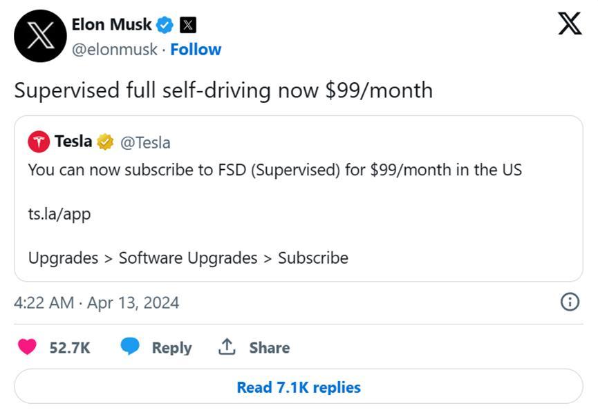 北美地区特斯拉FSD包月服务从199美元减至99美元