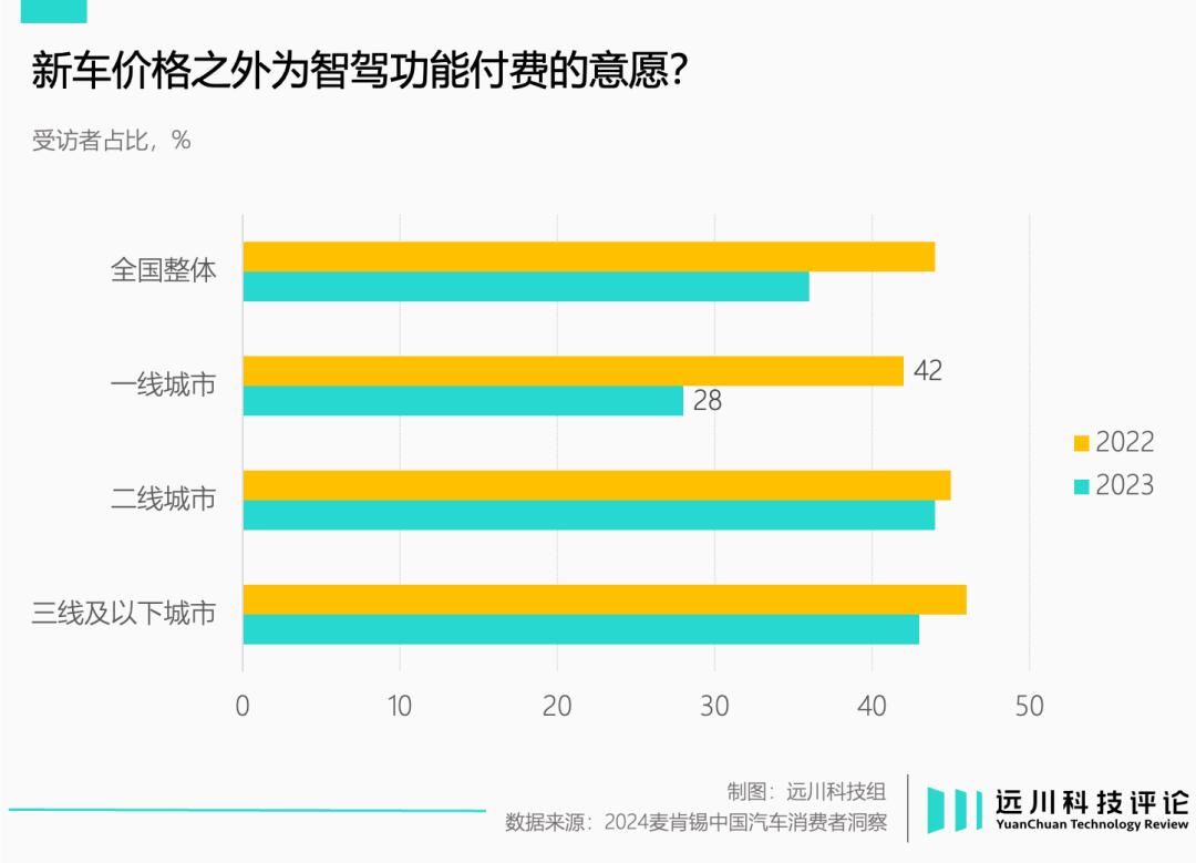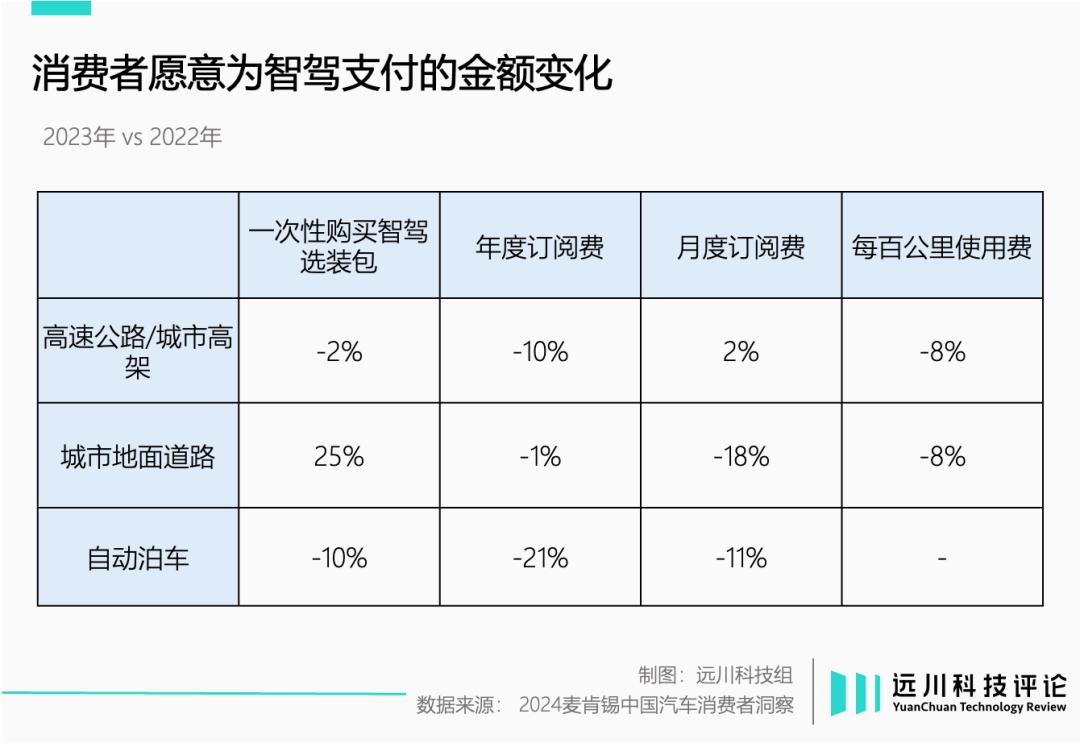 按照麦肯锡的调研,相比一年前,消费者为智驾功能单独付费的意愿和金额都出现明显下滑。