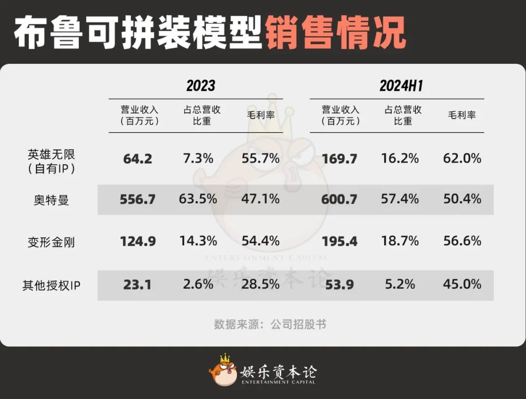 招股书显示,奥特曼在2023、2024年上半年为布鲁可贡献了63.5%、57.4%的营业收入。截至今年一季度,布鲁可在拼搭角色类玩具拥有255个SKU,其中奥特曼IP占到133个SKU。同时,或许是受到奥特曼上游授权费用的影响,奥特曼IP的毛利率低于变形金刚及布鲁可自有IP英雄无限。