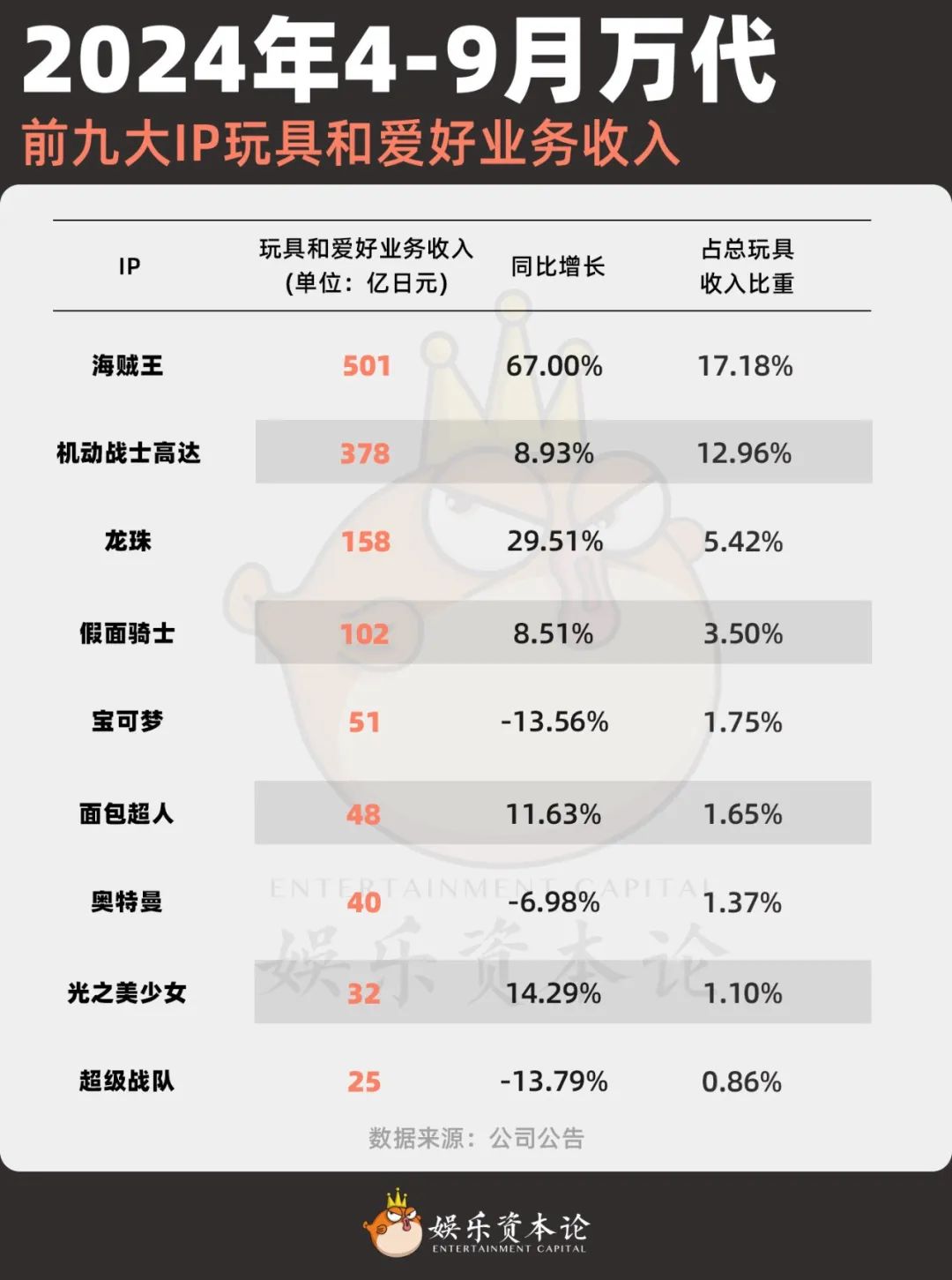 手握机动战士高达、龙珠、海贼王、火影忍者等绝对经典的大IP的万代南梦宫,在2024财年(截止至2024年3月30日)收入10502亿日元(约为人民币499亿);今年二、三季度收入6113.91亿日元(约为人民币287.5亿元)。