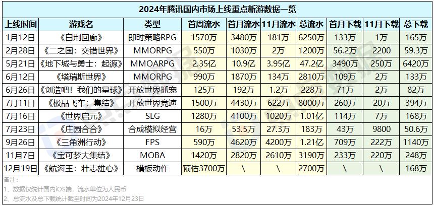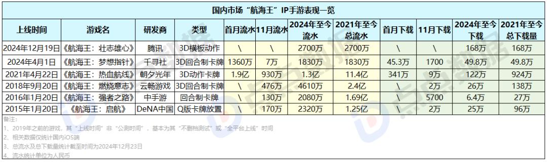 基于上述引发关注的点,点点出海将结合市场上其他《海贼王》IP改编手游的表现、2024年腾讯国内上线新游表现、《航海王:壮志雄心》的市场数据以及下述表格进行详细的分析与拆解。