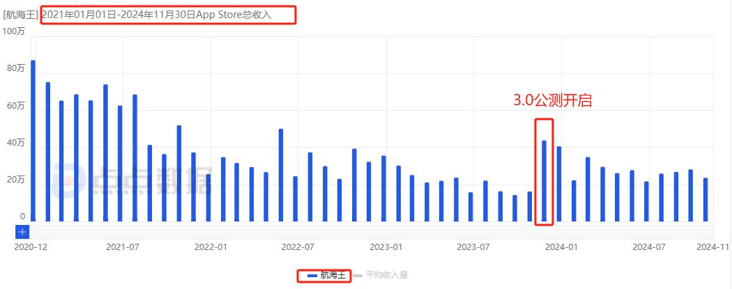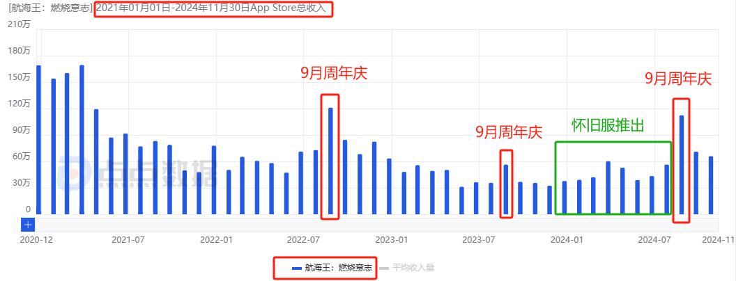 时间来到2023年,该年结束时其iOS月流水已经来到了250万左右,相当不理想,但今年3月28日推出的怀旧服让其稍微缓过来一口气,月流稳定在400万以上变成常态,11月达到了476万元是所有海贼漫改游戏收入第二高,其2024年至今的流水为4610万,同比去年增长了约20.1%。