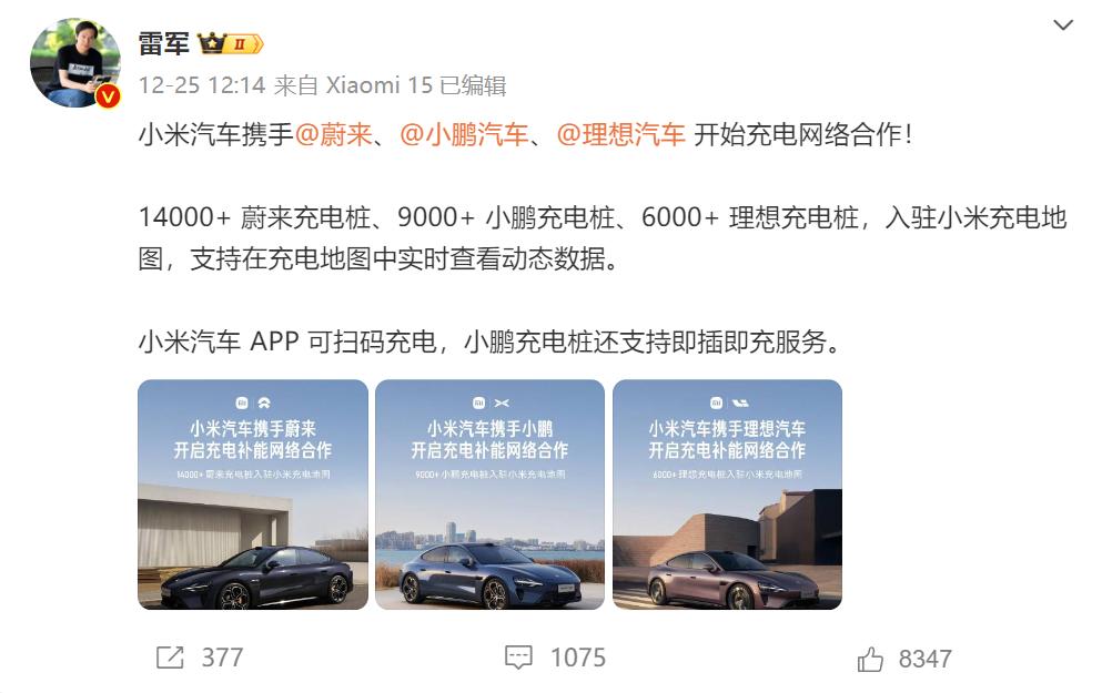 电车通还记得,在小米汽车高管拜访乐道的直播中,雷军提出“如果有需要的话,小米可以加入蔚来充电网络建设”。才大半年,这句话就成了现实,雷军正式官宣小米汽车与蔚来合作充电网络,还顺带拉上了小鹏和理想。