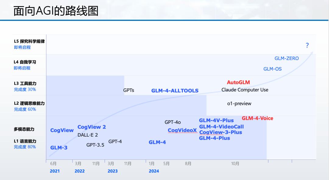 同时,智谱也定义了当前AGI的进度条。他们认为,L1的进度已经达到80%,L2的进度为60%,o1是推理模型的新范式;L3的进度只有40%,Agent的能力还处在非常早期的阶段;L4、L5才刚刚起步。