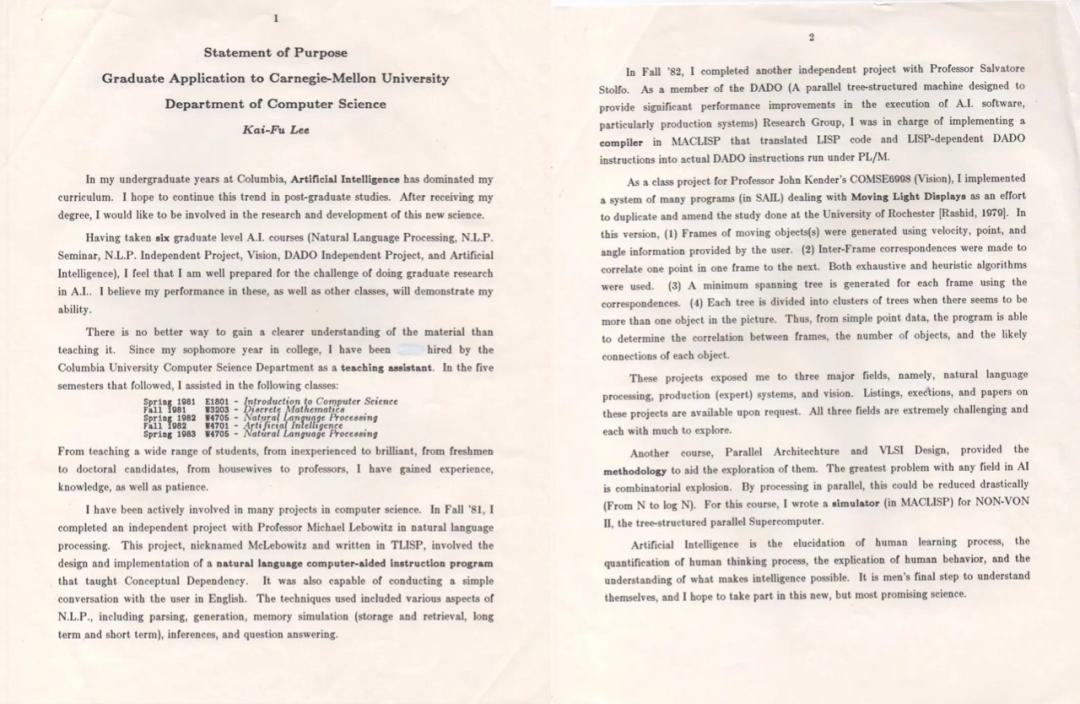 1983年李开复的CMU博士申请信