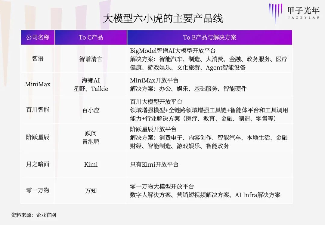 但也有小虎选择继续深入,做行业模型、垂直模型。2024年上半年表示“坚决做to C,不做不赚钱的to B”的零一万物,在下半年发布了面向电商直播的数字人解决方案,以及面向智算中心的AI Infra解决方案。百川智能则在核心医疗领域之外,发布了“全链路领域增强金融大模型Baichuan4-Finance”。