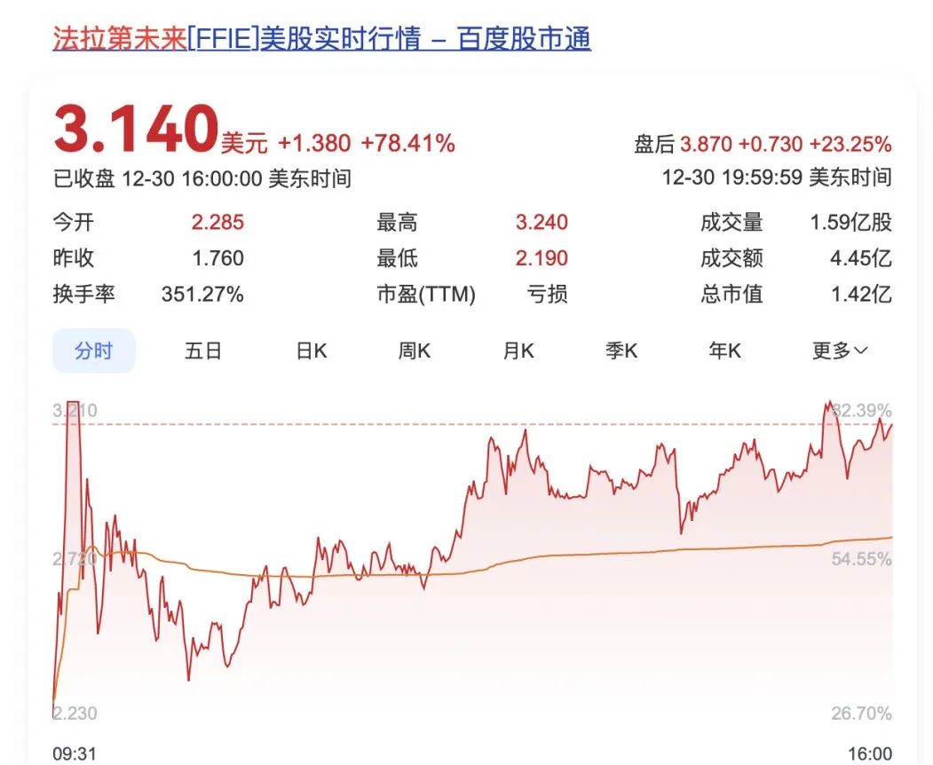 昨天,法拉第未来(Faraday Future)股价一路飙涨80%,并触发熔断。截至收盘,FF总市值爬升到1.42亿美元,约合人民币10.36亿元。