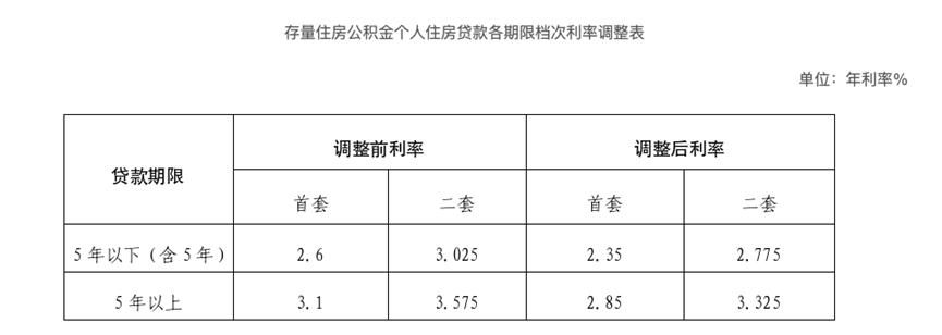 调整后,5年以下(含5年)和5年以上首套公积金贷款利率分别由2.6%和3.1%下调为2.35%和2.85%,第二套公积金贷款利率分别由3.025%和3.575%下调为2.775%和3.325%。