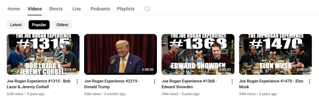爆发阶段中,视频播客的代表是 The Joe Rogan Experience(简称 JRE)走入大众视野,JRE是一档访谈类节目,嘉宾阵容非常豪华,包括埃隆·马斯克、爱德华·斯诺登、川普等,和 The Daily 一起常年霸占各大年度播客排行榜前三。Joe Rogan是一名喜剧演员、UFC评论员,JRE 在2010年发布,2013年开始在 YouTube发布视频版本,随后受欢迎程度逐渐提高,2015年开始成为全球知名的播客节目,影响力延续至今,下个阶段我们还会再次见到他。