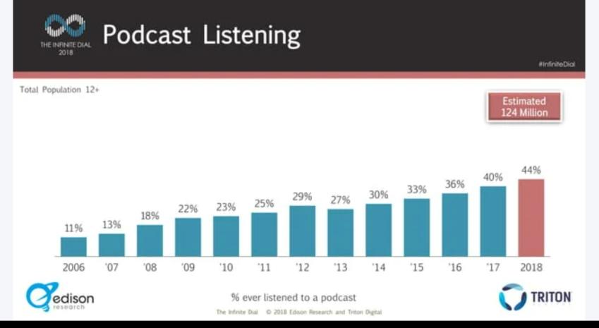 现象级播客的不断涌现,引发市场对播客的高度关注,2017年,Spotify进入播客市场,宣布将播客整合到平台中。随着视频播客带宽成本提高,越来越多创作者选择将节目上传到 YouTube。播客平台不再只是泛用型客户端和苹果内置播客应用,加上智能手机的普及,播客收听愈发便捷,成为很多人的生活习惯。Edison Research和Triton Digita发布的数据显示,在2018年,美国44%(12岁以上)的人口曾经听过播客。