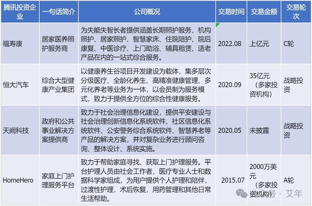 2022年,腾讯对国内居家养老服务提供商巨头「福寿康」提供了C轮上亿元投资;2015年,和多家投资机构一起,对美国家庭上门护理服务平台 HomeHero 提供了A轮2000万美元的投资。