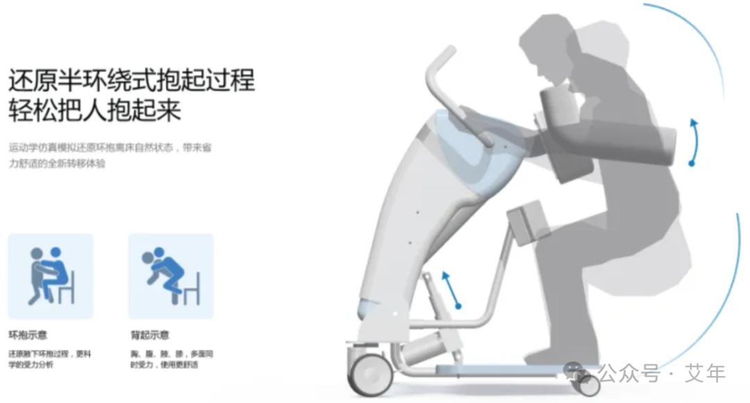 这款设备优化了传统的抱起动作,采用半环绕背负曲线和二段配合抬升设计,可以轻松把老人抱起,并轻松在轮椅、马桶、床等多场景转移,提高护理效率和老人移动的安全性。
