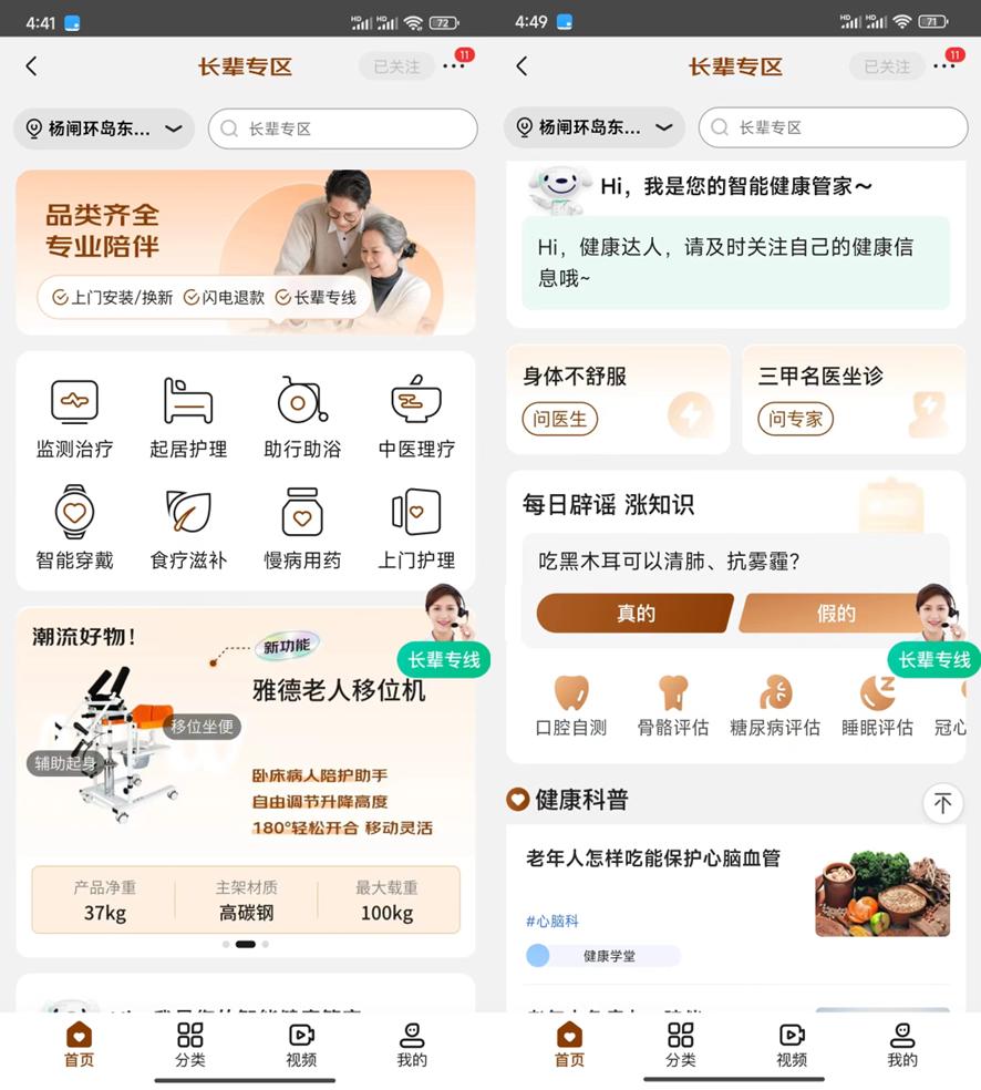 2024年,京东健康推出“长辈专区”,在京东App上搜索“健康养老”即可进入。该频道有监测治疗、起居护理、助行助浴、中医理疗、智能穿戴、食疗滋补、慢病用药、上门护理等适老化产品。