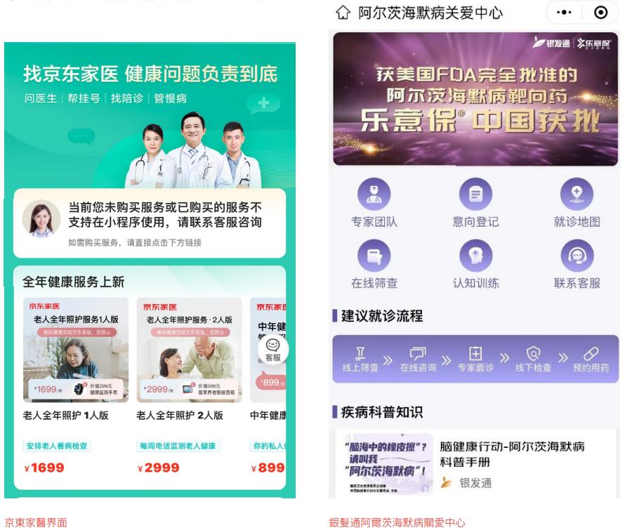 此外,京东健康已上线老年用户生活健康一站式服务平台「银发通」,旨在围绕阿尔茨海默病的「防、筛、诊、治、护」打造专病防治生态。已有超5000名老年病相关科室医生入驻平台,用户超20万人。