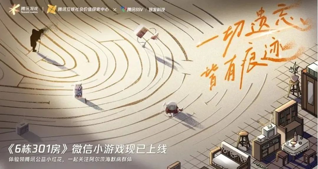 2023年9月,腾讯宣布,将捐赠近500万元,与北大六院、上海交通大学医学院合作,共同探索运用游戏和数字化方式。腾讯推出了一款科普游戏《6栋301房》,这款游戏通过设置任务,引导体验者直观感受阿尔兹海默症病人的日常生活。
