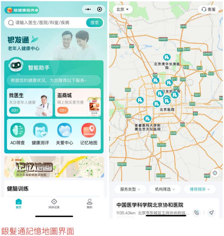 2023年9月,京东健康在「银发通」上推出患者关爱产品“记忆地图”,融合在线上线下资源,为阿尔茨海默病的早期筛查及全面防治提供了丰富的医疗机构信息。
