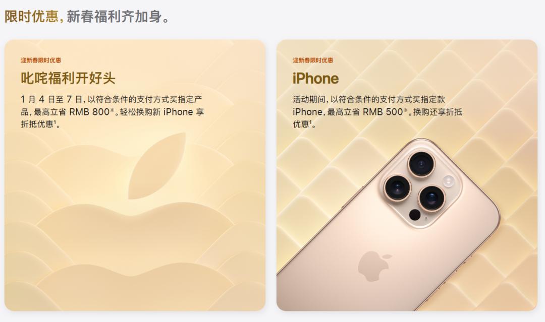 接着苹果就官宣了迎新春限时特惠,1月4日至7日,以符合条件的支付方式购买指定商品,最高立省800元。同时,如天猫平台针对iPhone 16 全系列提供200 元惊喜券,叠加后的优惠额度高至千元。