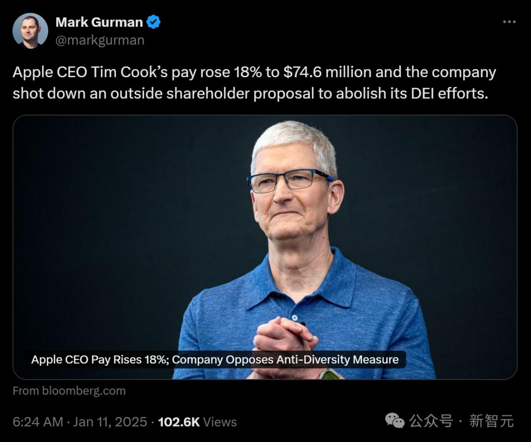 最近,库克的薪酬上涨了18%,达到7460万美元