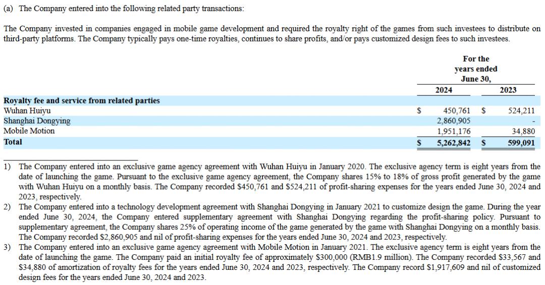 具体案例可以参考「关联交易」披露的信息。该栏显示,2024财年,关于游戏版权费及分成费的交易,Gamehaus分别向上海动影网络、Mobile Motion支付了286万美元和195万美元。