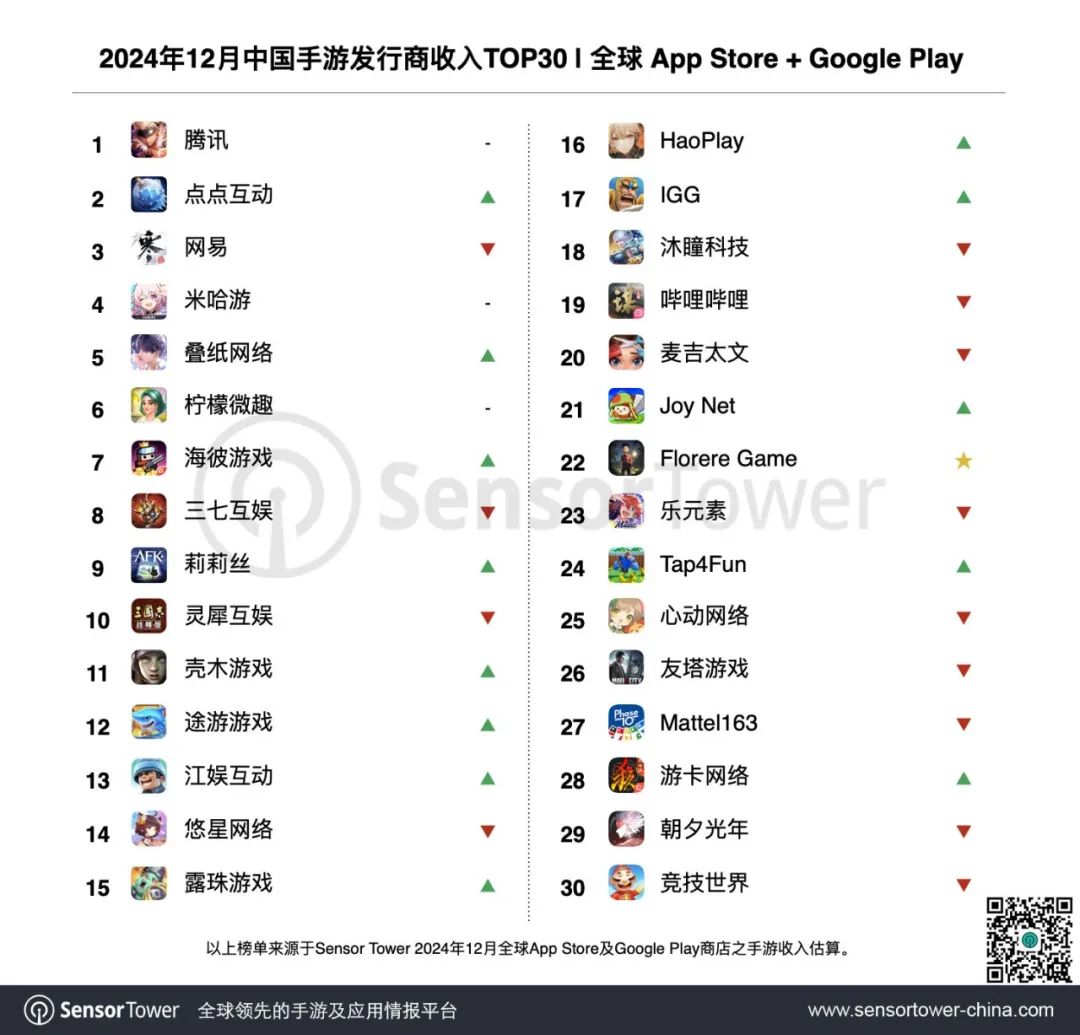 12月18日,米哈游《绝区零》全新1.4版本“星流霆击”正式上线,全新角色“星见雅”、“浅羽悠真”的登场和剧情、活动的推出,该游戏立即登顶中国App Store手游畅销榜,12月收入环比激增315%,重回榜单第11名。