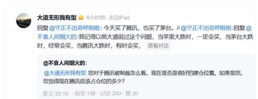 近日,段永平的雪球账号“大道无形我有型”和投资者“守正不出奇呼啦啦”互动称“今天买了腾讯,也买了茅台。”这是投资者在向其提问“您对腾讯被制裁怎么看,现在是否是很好的建仓位置,如果是您,您觉得腾讯应该占仓的多少?”的回答。