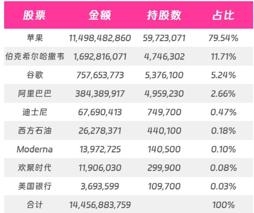 从下图持仓明细可以看出,段永平着重持仓的有苹果、伯克希尔哈撒韦、谷歌和阿里,这四家公司持仓总数占其美股持股的99.15%,尤其是苹果持仓占比高达79.54%。段永平从2011年就开始持仓苹果。而2011年苹果股价最高不过5.78美元,即便以高位入仓,段永平在苹果获得的收益也最少60倍。以段永平持有的苹果股份和股价计算,其在苹果股价市值约140亿美元。