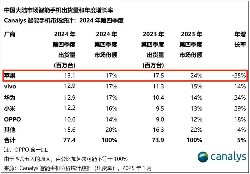 但2024年的四季度,苹果虽然仍维持了第一的宝座,但出货量却出现大幅下滑。据Canaly数据,2024年四季度,苹果在中国市场出货1310万台,在其传统旺季卫冕了第一的宝座,但出货量却同比下跌了25%,是前五大厂商中,唯一录得下滑的品牌。